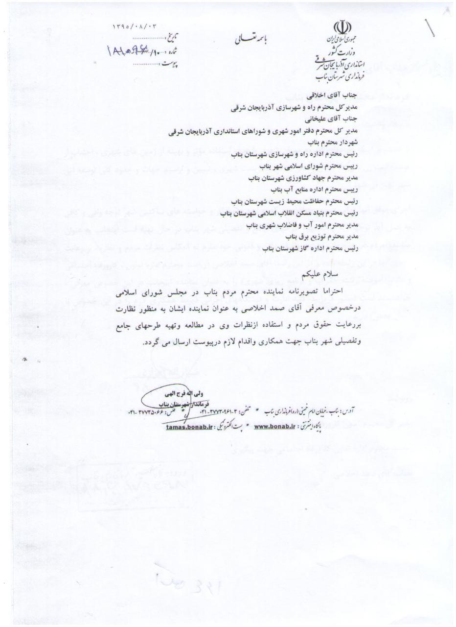 به گزارش انعکاس بناب، در این راستا فرماندار شهرستان بناب از کلیه ادارات شهرستان بناب خواست تا همکاری های لازم در این خصوص انجام گیرد. متن نامه ها به شرح زیر میباشد: انتهای پیام/۹۵/۷۵۹۲۵/۰۱ ا.چ