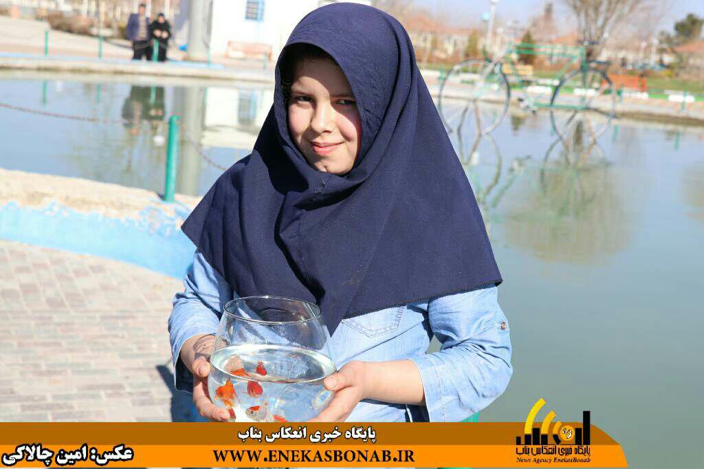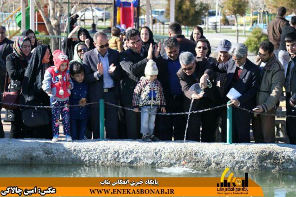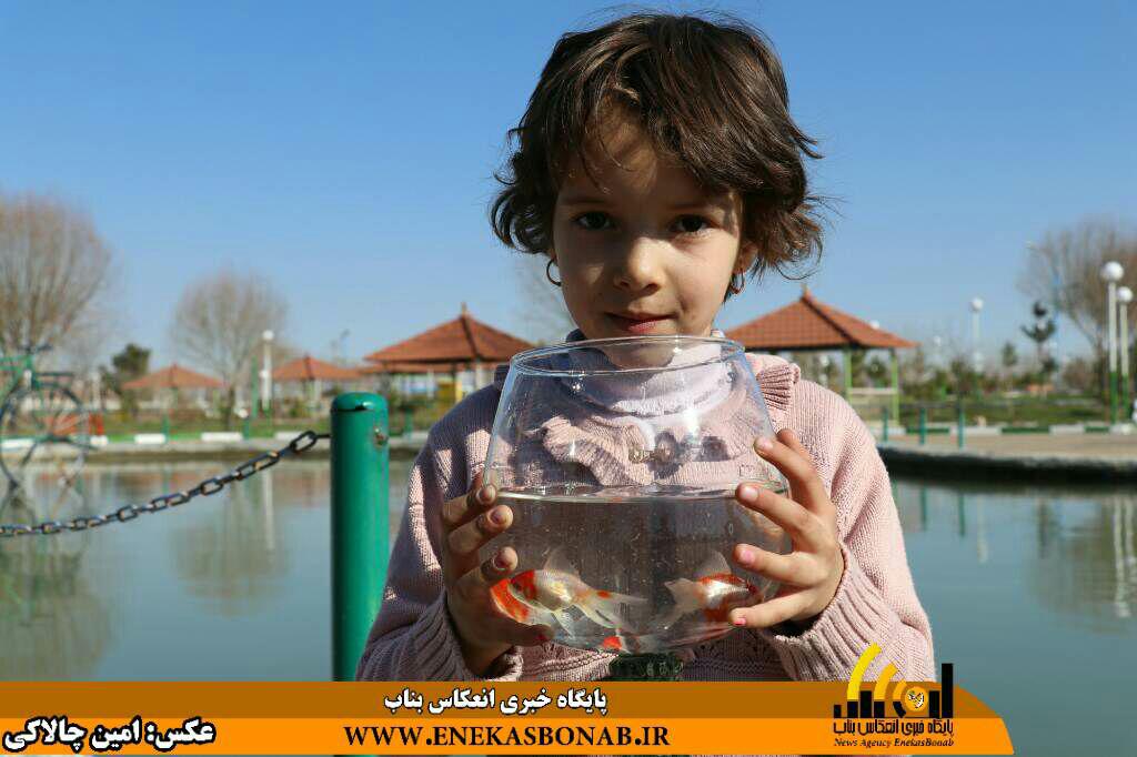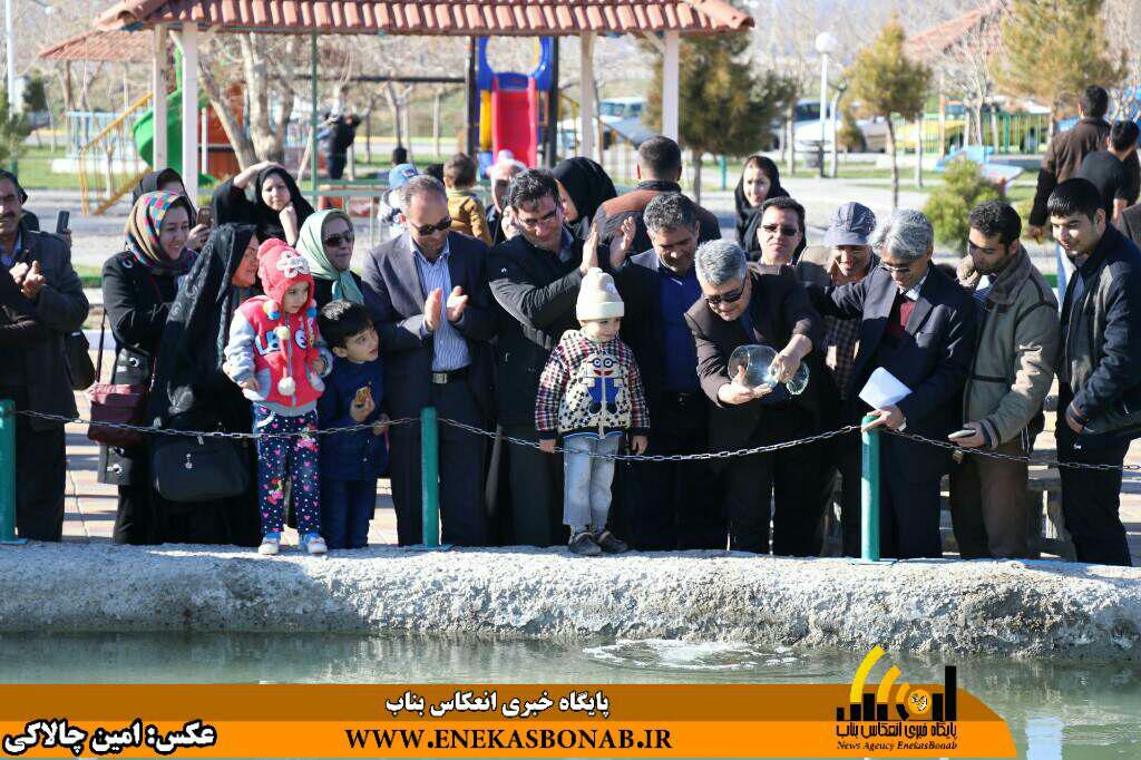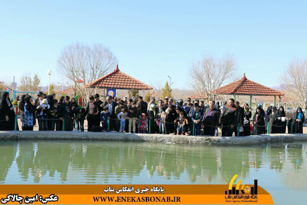 ماهی های عید با حضور شهردار بناب و رئیس اداره میراث فرهنگی، توسط شهروندان به حوض بزرگ این پارک رهاسازی شدند.