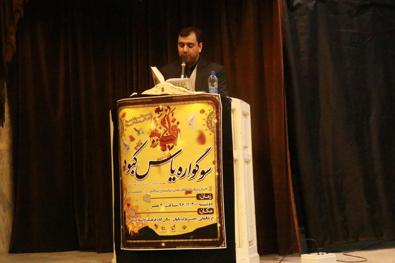 به گزارش انعکاس بناب، عصر امروز مراسم سوگواره یاس کبود باحضور حجت الاسلام رنجبر مسئول نهاد رهبری در دانشگاه بناب، رئیس اداره ارشاد اسلامی شهرستان وجمعی از بانوان این شهرستان در سالن اداره فرهنگ و ارشاد اسلامی برگزارشد.
