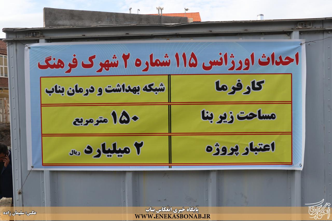 احداث اورژانس 115 شماره 2 در محل شهرک فرهنگ بناب با زیربنای 150 متر مربع با اعتباری بالغ بر 2 میلیارد ریال شروع شد.