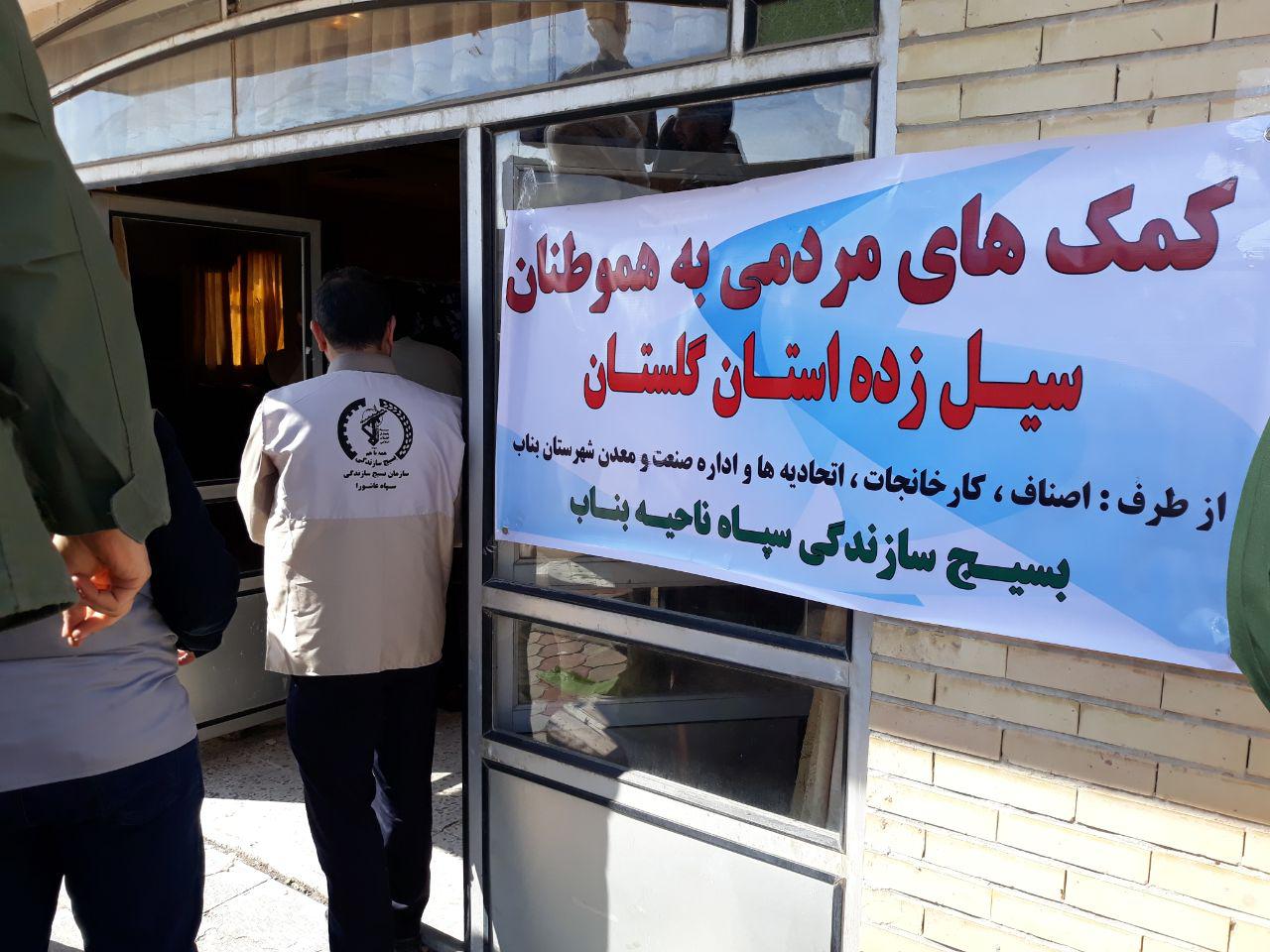 به گزارش انعکاس بناب، سرهنگ یحیی حیدری در حاشیه ارسال این محموله کمکی اظهار داشت: دومین محموله کمک های مردمی شهرستان بناب از طرف بسیج سازندگی سپاه ناحیه بناب، اصناف، کارخانجات، اتحادیه ها، حوزه بسیج کربلا و اداره صنعت، معدن و تجارت شهرستان بناب در قالب دو کامیون به مناطق سیل زده استان‌های گلستان و مازندران ارسال شد.