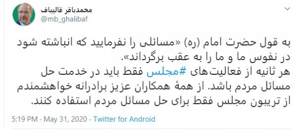 به گزارش خبرگزاری انعکاس بناب به نقل از فارس، محمد باقر قالیباف رئیس مجلس شورای اسلامی در صفحه شخصی خود در توئیتر خاطرنشان کرد: