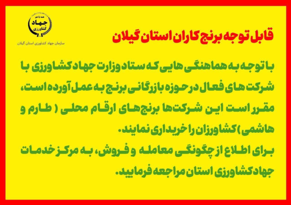 به گزارش انعکاس بناب به نقل از خبرگزاری فارس، سازمان جهاد  کشاورزی استان گیلان با صدور بیانیه ای اعلام کرد« با توجه به هماهنگی‌هایی که ستاد وزارت جهاد کشاورزی با شرکتهای فعال در حوزه بازرگانی برنج به عمل آورده است، مقرر است این شرکت‌ها برنج های ارقام محلی (طارم و هاشمی) کشاورزان را خریداری نمایند.