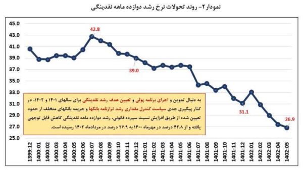 همچنین، نرخ رشد دوازدهماهه نقدینگی در پایان مردادماه ۱۴۰۲ با ۱۰٫۹واحد درصد کاهش نسبت به دوره مشابه سال قبل (معادل ۳۷٫۸ درصد در مرداد ماه ۱۴۰۱) به ۲۶٫۹ درصد رسید که حاکی از اهتمام و تمرکز بانک مرکزی بر اجرای سیاست کنترل مقداری رشد ترازنامه بانکها و کنترل رشد خلق پول بانکها و به تبع آن رشد نقدینگی در سال جاری بوده است.
