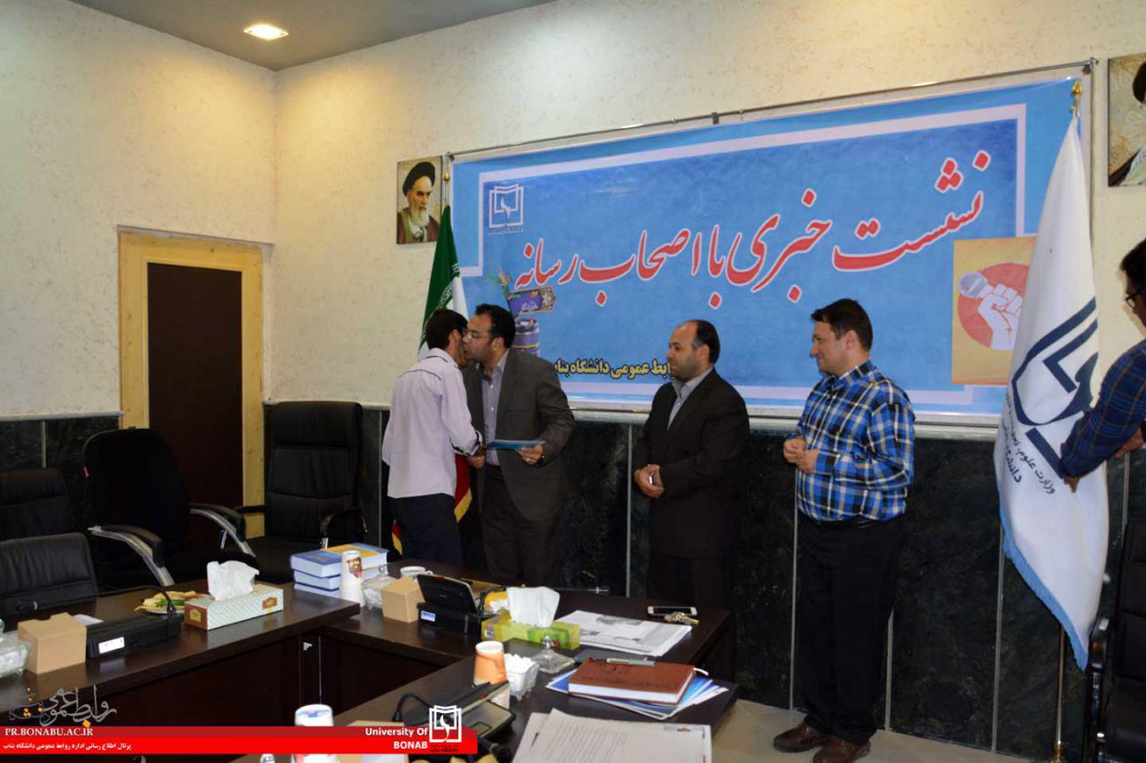 گفتنی است پس از پایان سخنان ریاست و هیات رئیسه دانشگاه بناب، مراسم تجلیل از خبرنگاران با اهدای لوح تقدیر و هدایایی، برگزار شد؛ سپس خبرنگاران با همراهی رئیس و اعضای هیات رئیسه از پروژه های عمرانی دانشگاه بازدید کردند.