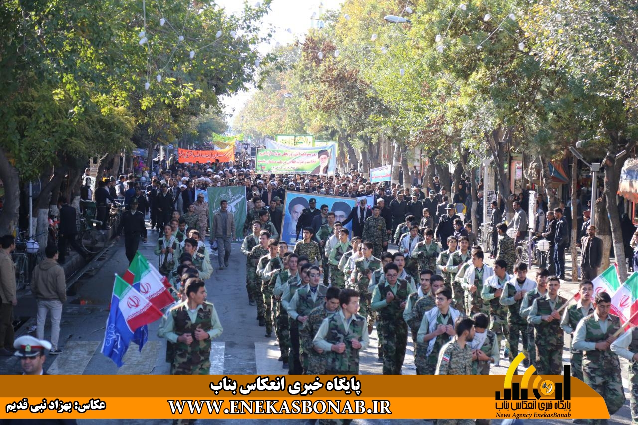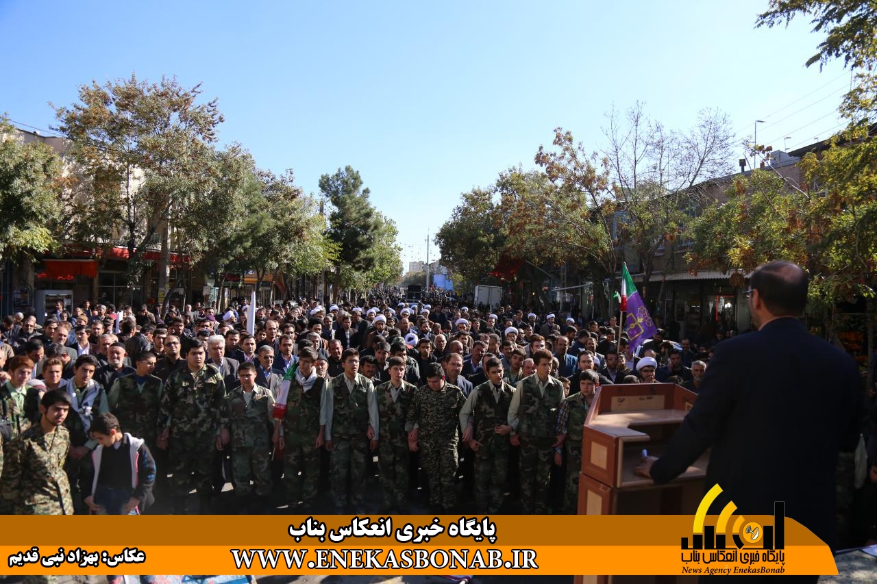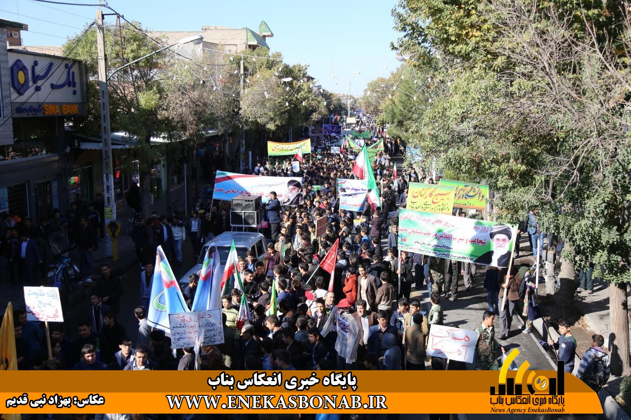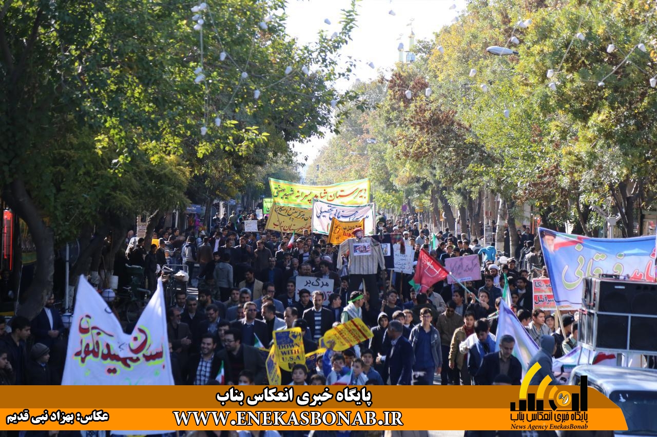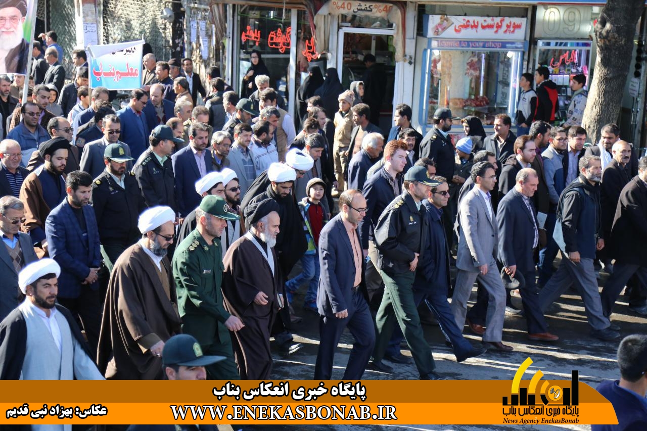 راهپیمایی بناب با حضور اقشار مختلف، فرماندار، روحانیان و مسئولان ادارات ونهادهای بناب از خیابان بهشتی آغاز شد و شرکت کنندگان در این راهپیمایی بعد از طی مسیرهای خیابان زرگران و باهنر  با تجمع در مقابل مصلی بناب باردیگر بر دفاع ارزش های انقلاب اسلامی و انزجار از شیطان بزرگ تاکید کردند.