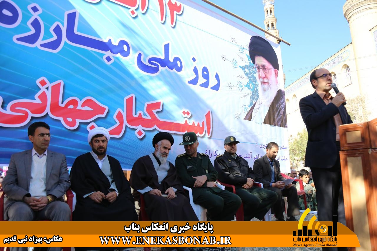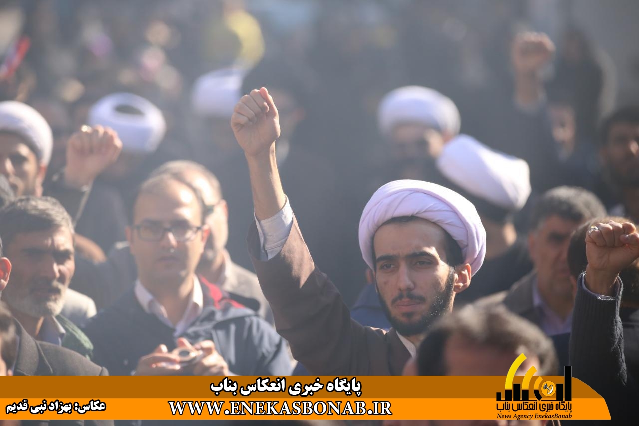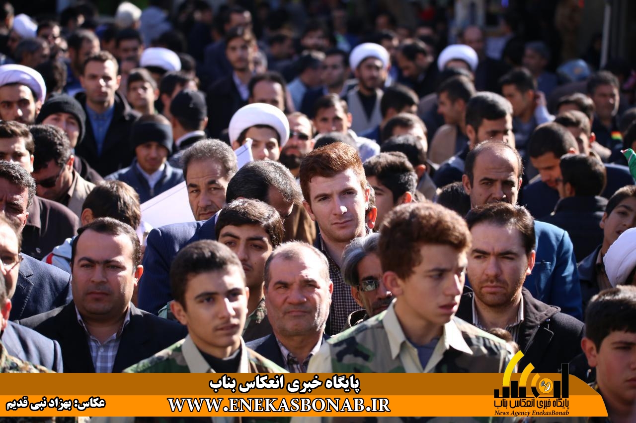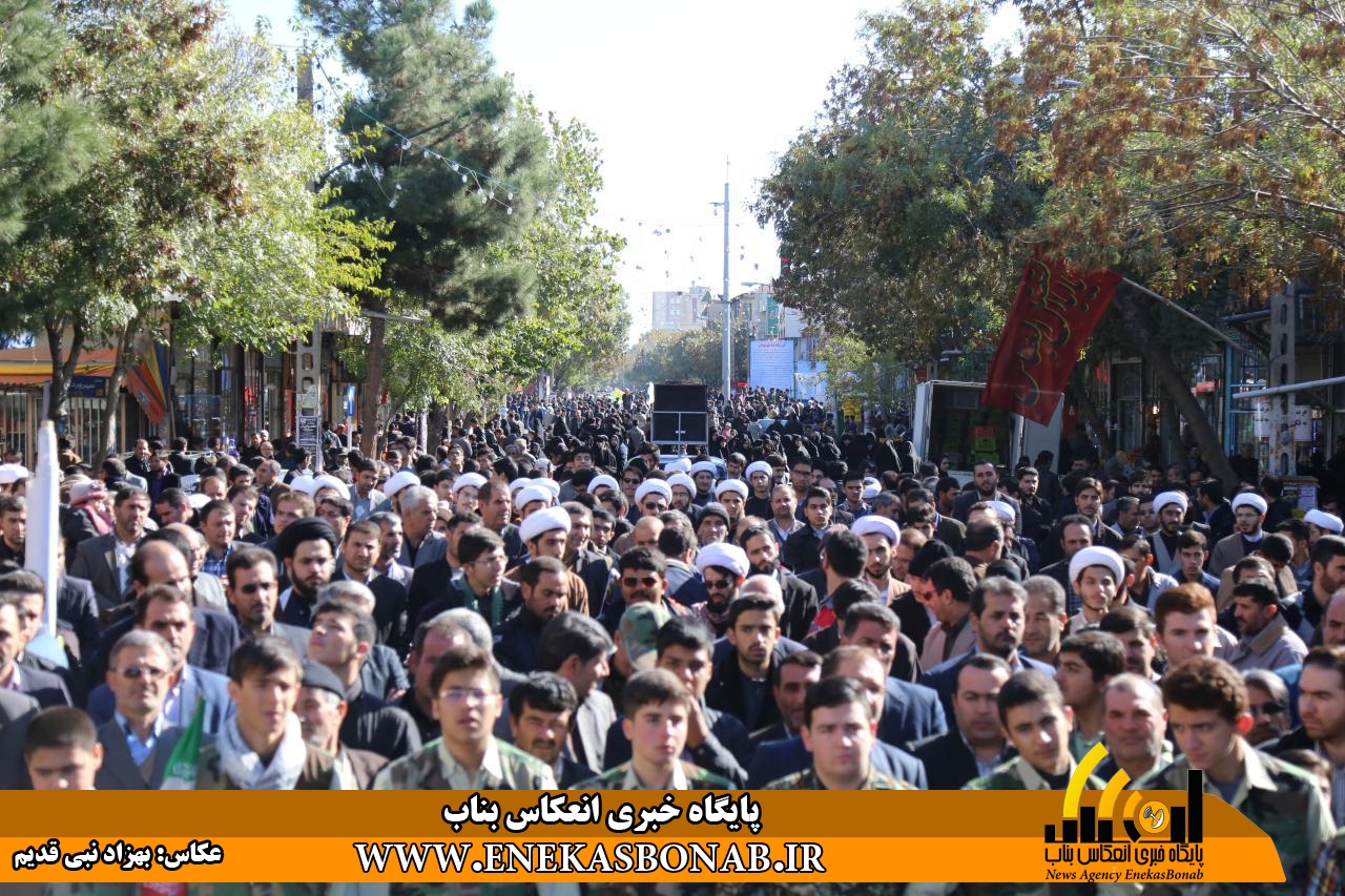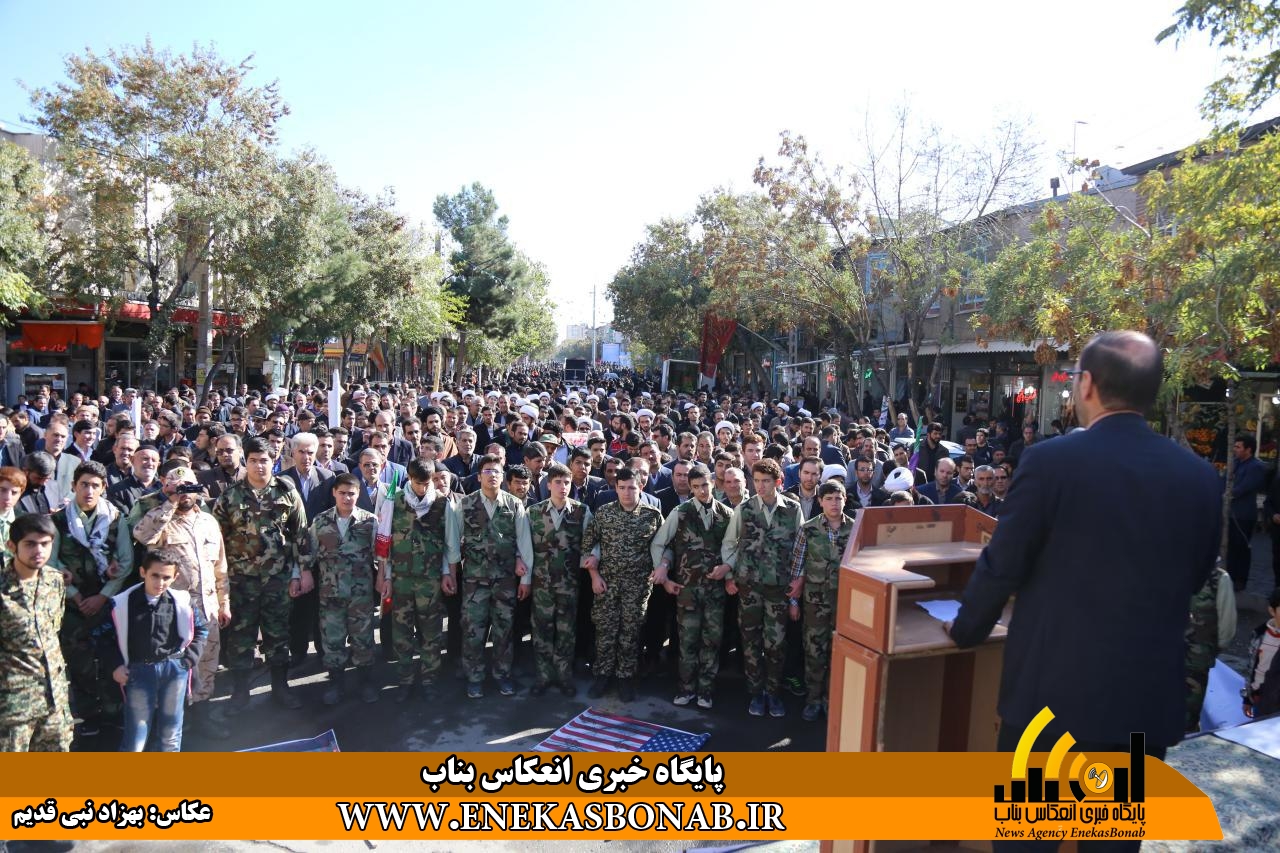 راهپیمایی بناب با حضور اقشار مختلف، فرماندار، روحانیان و مسئولان ادارات ونهادهای بناب از خیابان بهشتی آغاز شد و شرکت کنندگان در این راهپیمایی بعد از طی مسیرهای خیابان زرگران و باهنر  با تجمع در مقابل مصلی بناب باردیگر بر دفاع ارزش های انقلاب اسلامی و انزجار از شیطان بزرگ تاکید کردند.