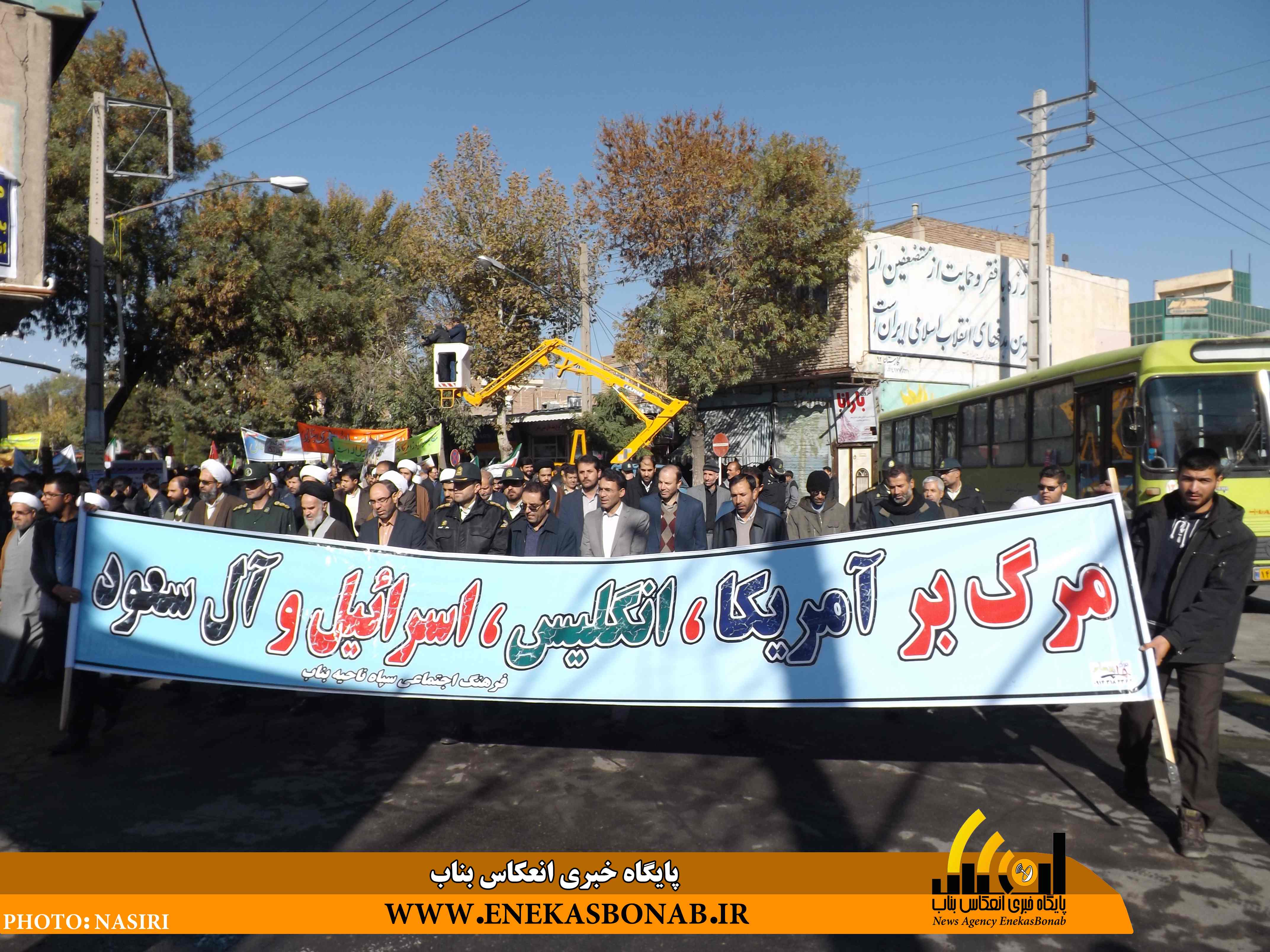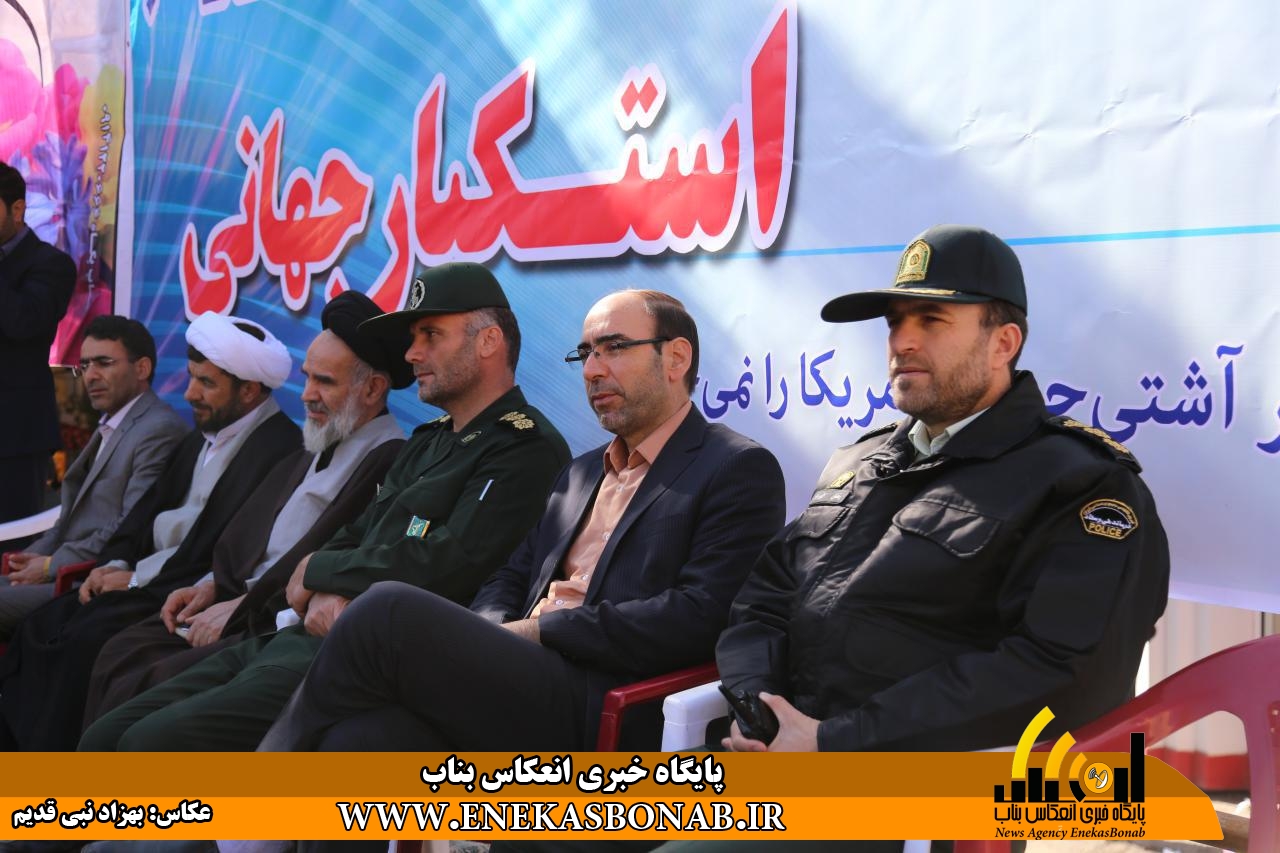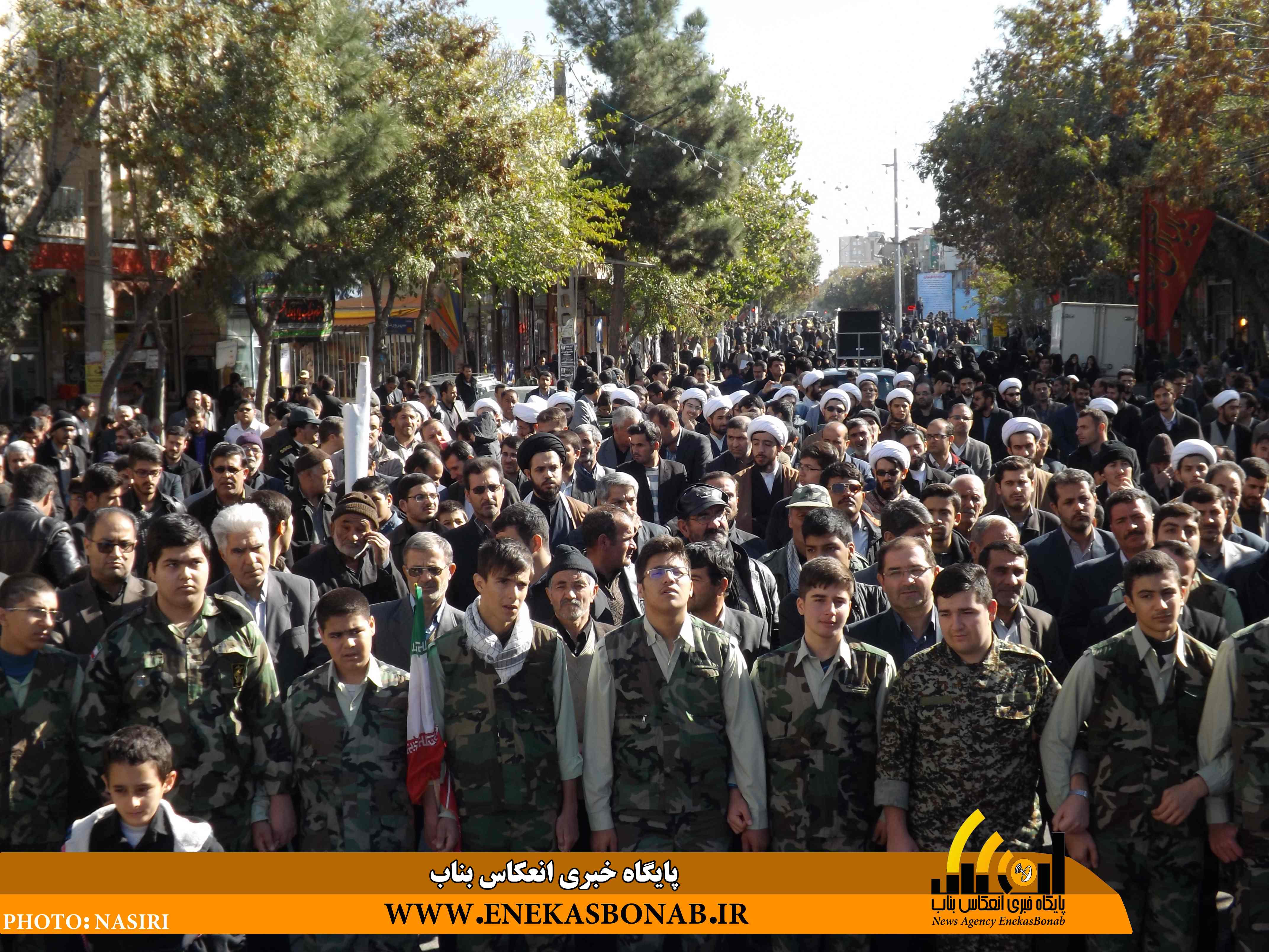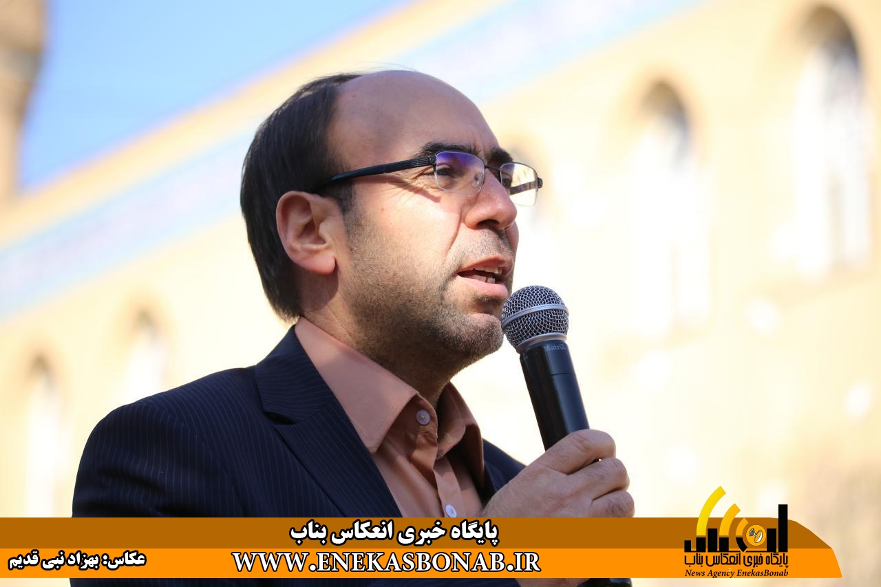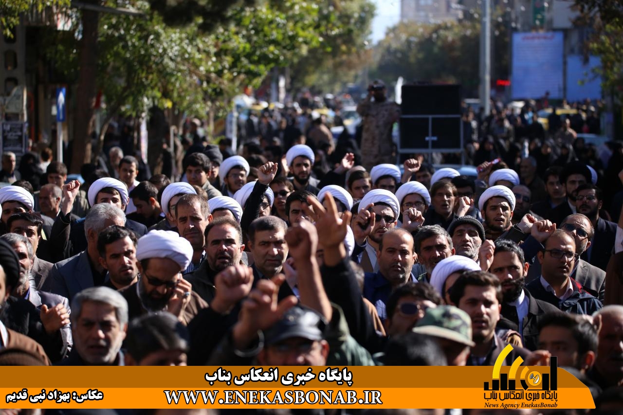 راهپیمایی بناب با حضور اقشار مختلف، فرماندار، روحانیان و مسئولان ادارات ونهادهای بناب از خیابان بهشتی آغاز شد و شرکت کنندگان در این راهپیمایی بعد از طی مسیرهای خیابان زرگران و باهنر  با تجمع در مقابل مصلی بناب باردیگر بر دفاع ارزش های انقلاب اسلامی و انزجار از شیطان بزرگ تاکید کردند.