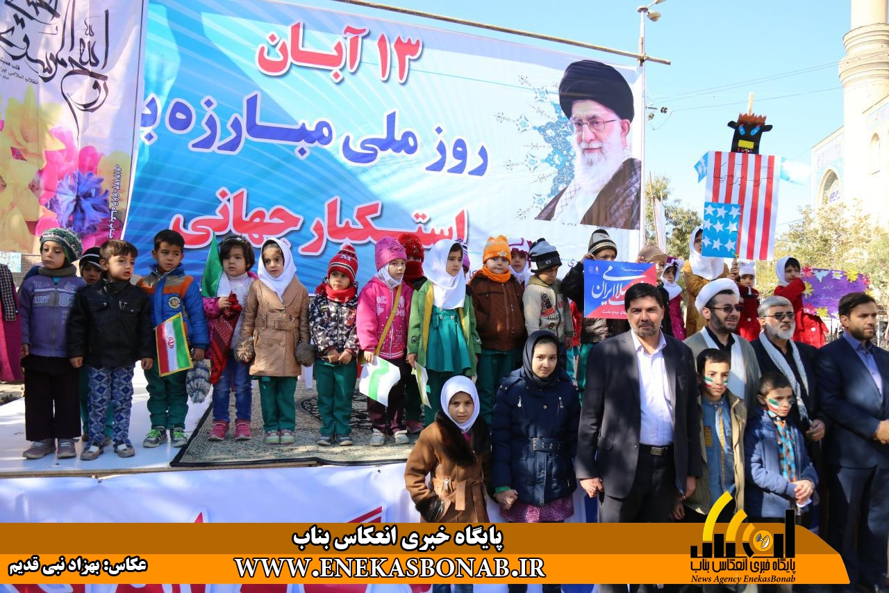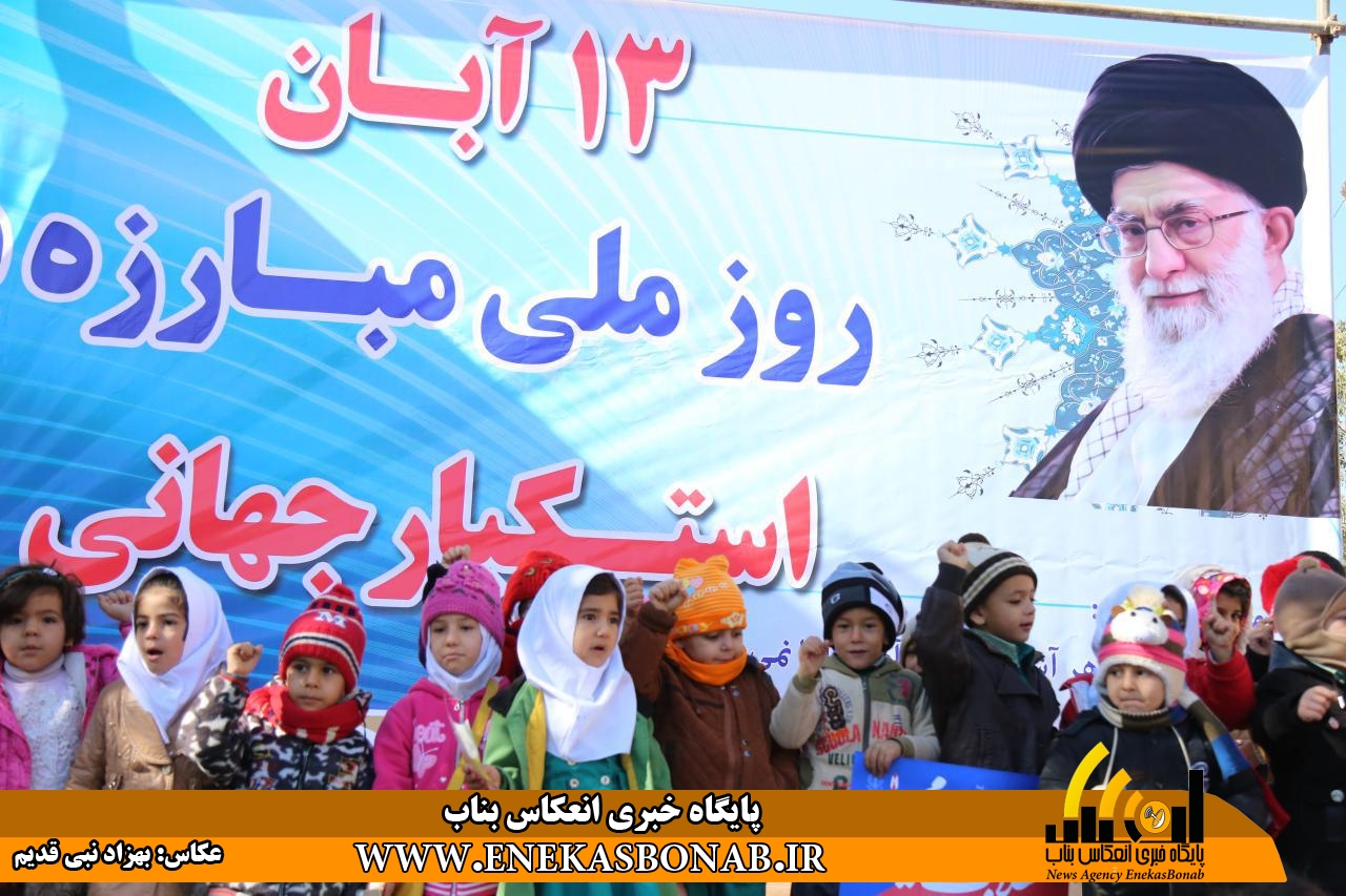 به گزارش انعکاس بناب، شرکت کنندگان در راهپیمائی ۱۳ آبان روز حماسی و ملی مبارزه با استکبار جهانی باشعارهای کوبنده مرگ برامریکا، مرگ براسرائیل بار دیگر با آرمان های امام خمینی (ره)، شهدای انقلاب و مقام معظم رهبری تجدید میثاق کردند.