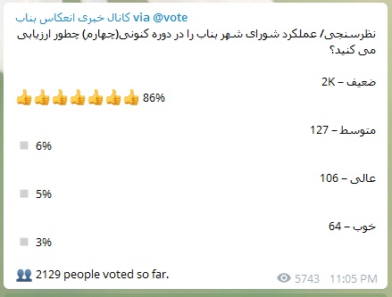 نظر سنجی نشان می دهد که تنها ۵ درصد کاربران در سطح عالی از عملکرد شورا رضایت دارند، این آمار احساس وظیفه ما مردم را چندین برابر می کند، که در انتخاب خود در دوره پنجم انتخابات شورای شهر خطا نکنیم، آینده این شهرستان، عمران و آبادانی این دیار آب و آفتاب و کتاب، به انتخاب ما بستگی دارد.