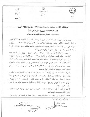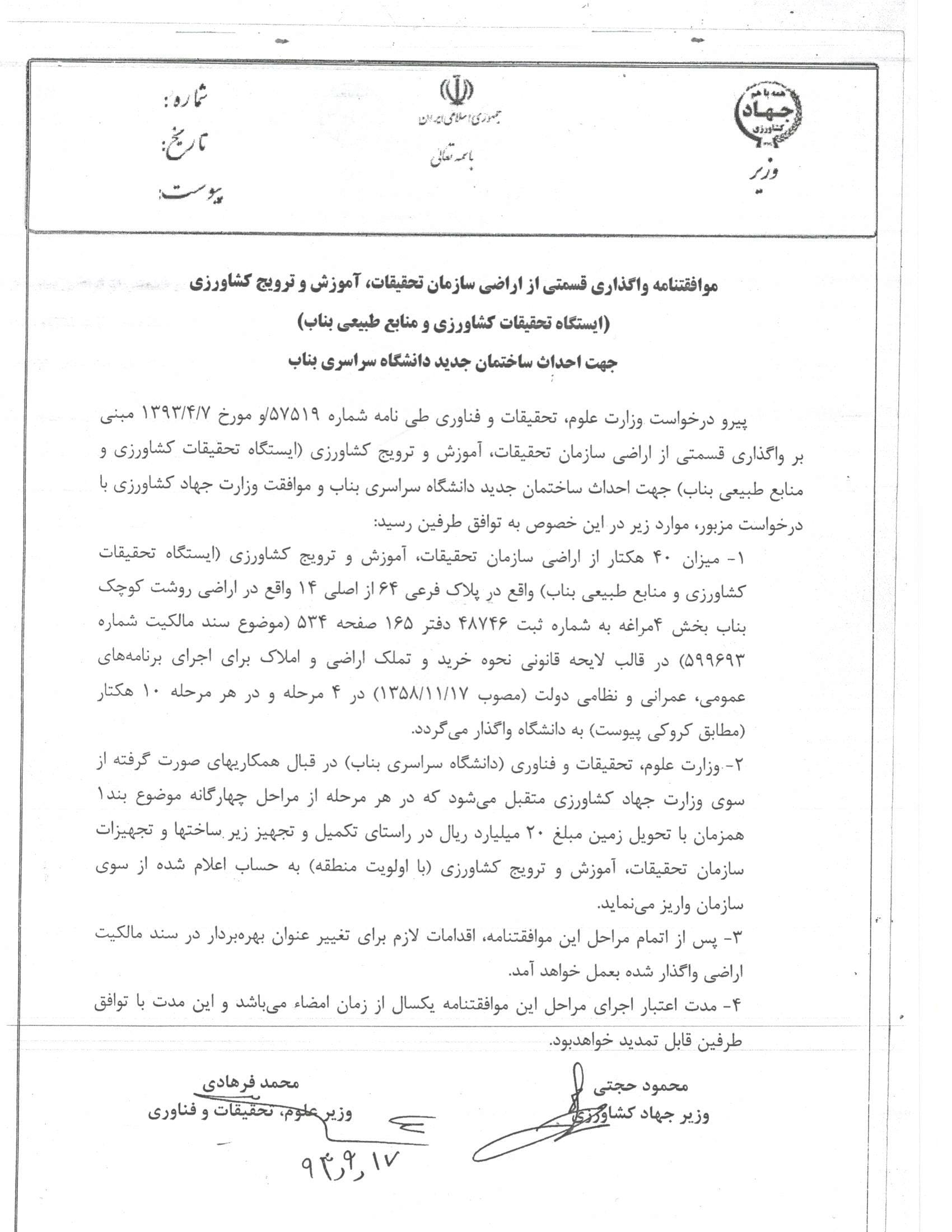 در سال ۹۳، به دلیل راکد ماندن پروژه های عمرانی نام برده شده در بالا، مسئولین دانشگاه مصمم به حل مشکل کمبود زمین دانشگاه برای همیشه بودند که بدلیل قیمت بسیار زیاد زمین های اطراف سایت کنونی دانشگاه بناب، امکان توسعه در سایت کنونی مقدور نگردید و در این راستا، طی موافقتنامه­ای که به امضای وزرای وقت علوم و جهاد کشاورزی رسید، ۴۰ هکتار از زمین های مرکز تحقیقات جهاد کشاورزی به دانشگاه بناب واگذار گردید که از همان روزهای ابتدایی کار ساخت و ساز پروژه­های نامبرده شده (ساختمان کلاس ها به متراژ ۴۰۰۰ متر مربع، ساختمان کتابخانه به متراژ ۲۰۰۰ متر مربع، ورزشگاه دانشگاه و دیوار کشی سایت) از محل همان درآمد اختصاصی دانشگاه شروع شد. (به پیوست توافقنامه امضا شده توسط وزرای محترم علوم و جهاد ارسال می گردد).(جلسه مذکور با حضور وزیر محترم جهاد کشاورزی، نماینده وزارت علوم، تحقیقات و فناوری، امام جمعه محترم شهرستان بناب، نماینده محترم قبلی شهرستان حاج آقا شیخ رضا باقری بنابی، جناب آقای دکتر صدیقی بنابی نماینده پیشین شهرستان، فرماندار محترم سابق شهرستان جناب آقای مهندس فرج اللهی در محل دفتر وزیر محترم جهاد برگزار گردید و وزیر محترم جهاد به اتحاد و پیگیری و علم دوستی ما بنابی ها افتخار کردند و علی رغم نظر بسیار بالای سه نفر کارشناس دادگستری برای قیمت زمین و با مسئولیت خودشان و با تخفیف ویژه زمین یاد شده را در اختیار دانشگاه بناب قرار گرفت). در اینجا بر خود وظیفه می دانم از تک تک این عزیزان و سروران بزرگوار برای حل مشکل زمین دانشگاه بناب تشکر و قدردانی نمایم.