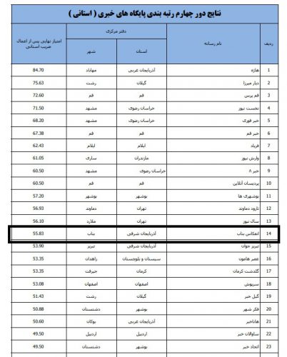 امروز مفتخریم که با همراهی شما مردم عزیز بناب و مسئولان شهرستان، پایگاه خبری انعکاس بناب در جدیدترین رتبه بندی پایگاه های خبری کل کشور توانست با کارنامه ای قابل توجه بدرخشد.