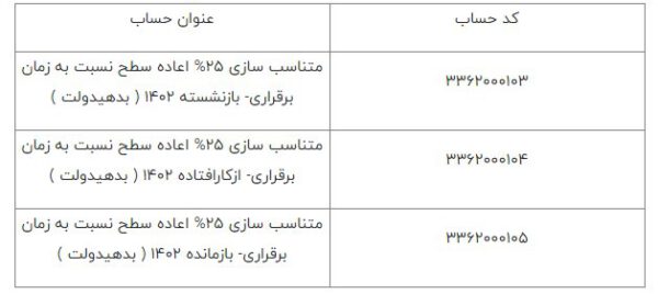 همچنین به منظور تکمیل آیتم متناسبسازی ۷۵ درصد اعاده سطح نسبت به زمان برقراری در خصوص مشمولین وفق بخشنامه شماره ۱/۷۶ مستمریها، آیتم «متناسبسازی ۲۵ درصد باقیمانده اعاده سطح نسبت به زمان برقراری» با کد (۰۰۰۴۲) محاسبه و به همراه مبلغ مستمری سال ۱۴۰۱، مشمول افزایش سال ۱۴۰۲ شده است.