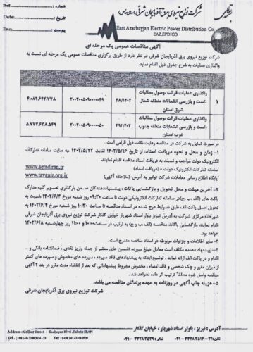 اگهی مناقصه شرکت توزیع برق استان آذربایجان شرقی