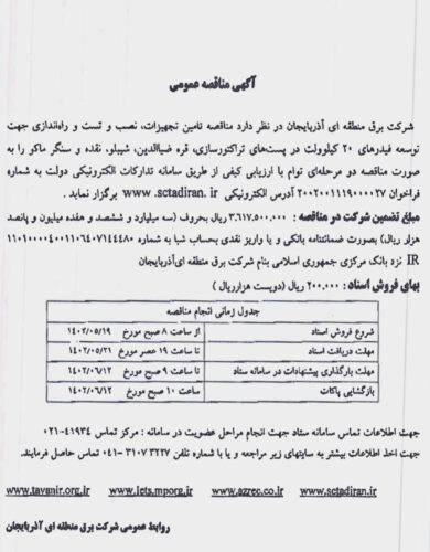آگهی مناقصه عمومی شرکت برق منطقه ای آذربایجان شرقی