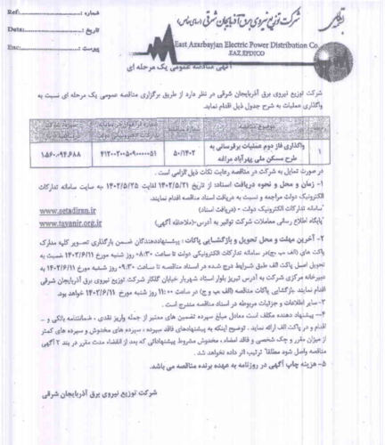آگهی مناقصه شرکت توزیع نیروی برق استان آذربایجان شرقی