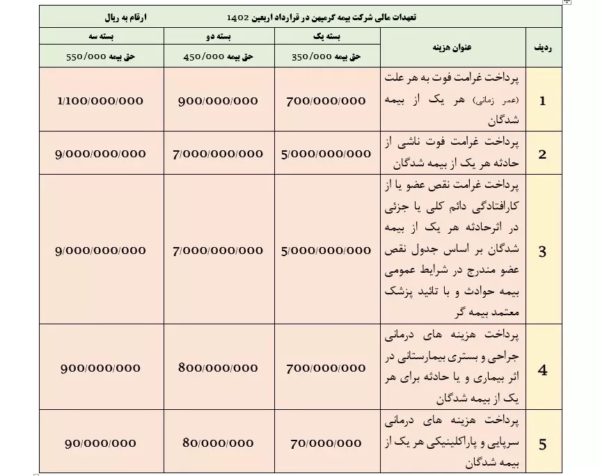 ۳- جهت تنویر بیشتر ارائه خدمات و پوشش های بیمه ای مورد تعهد توسط شرکت بیمه گر، لیست تعهدات بیمه به شرح جدول ذیل جهت آگاهی زوار عزیز اعلام می گردد :