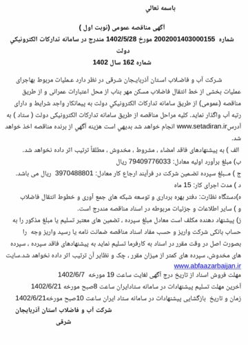 آگهی مناقصه شـرکت آب و فاضـلاب اسـتان آذربایـجان شـرقی