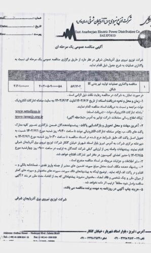 اگهی مناقصه شرکت توزیع نیروی برق استان آذربایجان شرقی