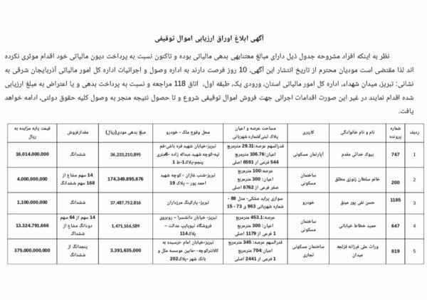 اداره کل امور مالیاتی استان آذربایجان شرقی اموال تعدادی از بدهکاران مالیاتی را از طریق اوراق ارزیابی توفیقی به فروش گذاشت.