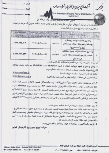 آگهی تجدید مناقصه شرکت توزیع نیروی برق استان آذربایجان شرقی