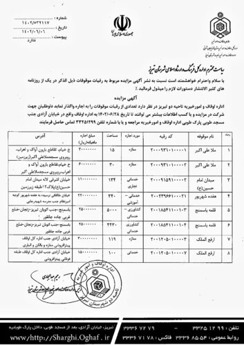 اگهی مزایده اجاره اداره اوقاف و امور خیریه ناحیه دو تبریز