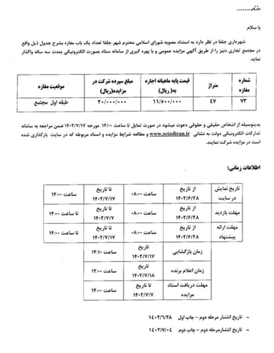 شهرداری جلفا در نظر دارد یک باب مغازه را به مدت سه ساله از طریق برگزاری مزایده طبق شرایط زیر واگذار نماید.