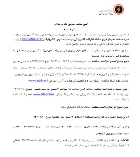 شرکت تولید نیروی برق آذربایجان در نظر دارد از طریق برگزاری مناقصه عمومی یک مرحله ای؛ عایق حرارتی واحدهای نیروگاه گازی ارومیه را طبق شرایط زیر واگذار نماید.