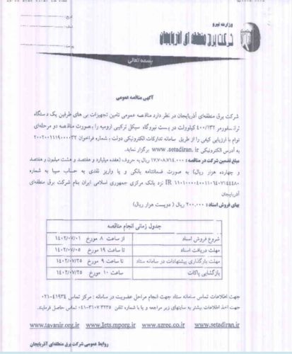 آگهی مناقصه شرکت برق منطقه ای آذربایجان