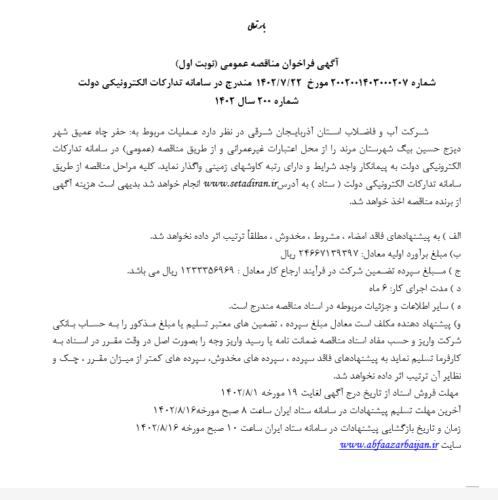 شـرکت آب و فاضـلاب اسـتان آذربایـجان شـرقی در نظر دارد عـملیات مربوط به: حفر چاه عمیق شهر دیزج حسین بیگ شهرستان مرند را از محل اعتبارات غیرعمرانی و از طریق مناقصه (عمومی) در سامانه تدارکات الکترونيکي دولت به پیمانکار واجد شرایط و دارای رتبه کاوشهای زمینی واگذار نماید.