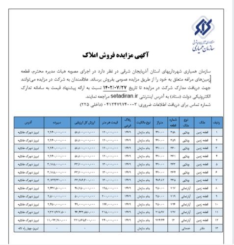 سازمان همیاری شهرداریهای استان آذربایجان شرقی در نظر دارد در اجرای مصوبه هیات مدیره محترم، قطعه زمینهای مراغه متعلق به خود را از طریق مزایده عمومی بفروش برساند.