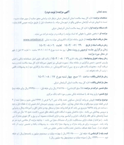 شرکت بیمه سلامت استان آذربایجان شرقی در نظر دارد دو باب آپارتمان واقع در شهرستان میانه را از طریق مزایده به فروش برساند.