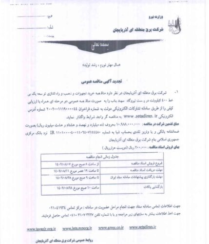 شرکت برق منطقه ایی آذربایجان در نظر دارد خرید تجهیزات و نصب و راه اندازی توسعه یک بی خط 400 کیلووات در ست نیروگاه سهند بناب را از طریق برگزاری مناقصه واگذار نماید.