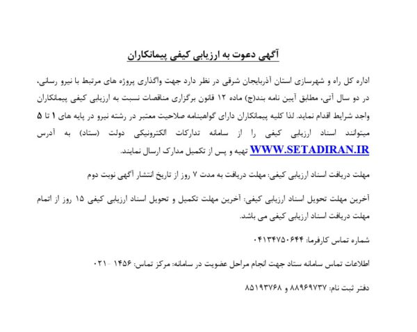 اداره کل راه و شهرسازی استان آذربایجان شرقی در نظر دارد جهت واگذاری پروژه های مرتبط با نیرو رسانی، در دو سال آتی، مطابق آیین نامه بند(ج) ماده 12 قانون برگزاری مناقصات نسبت به ارزیابی کیفی پیمانکاران واجد شرایط اقدام نماید.