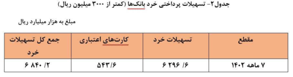 با توجه به اینکه تسهیلات پرداختی در قالب کارتهای اعتباری نیز در بخش خانوار پرداخت شده است، با این اوصاف سهم بخش خانوار از ۱۶٫۸درصد در جدول-۱، به ۱۸٫۳ درصد کل تسهیلات پرداختی افزایش مییابد.(جدول۲)