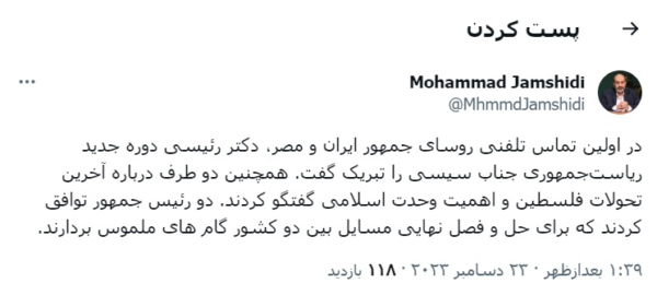 محمد جمشدی معاون سیاسی دفتر رییس جمهور ضمن اشاره به این تماس تلفنی در توئیتی نوشت: «در اولین تماس تلفنی روسای جمهور ایران و مصر، دکتر رئیسی دوره جدید ریاستجمهوری جناب سیسی را تبریک گفت. همچنین دو طرف درباره آخرین تحولات فلسطین و اهمیت وحدت اسلامی گفتگو کردند. دو رئیس جمهور توافق کردند که برای حل و فصل نهایی مسایل بین دو کشور گام های ملموس بردارند.»